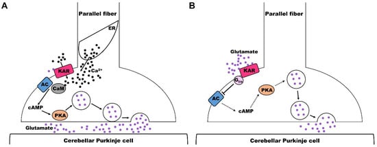 Schematic diagram of KAR-mediated facilitation or depression of glutamate release at PF–PC synapses of cerebellum. (A) The proposed mechanism of KAR-mediated facilitation of glutamate release at PF–PC synapses of cerebellum. Low concentration of KA enhances glutamate release through the activation of Ca2+ permeable KARs and the induction of Ca2+ from the internal reserves in endoplasmic reticulum (ER). The increase in cytosolic Ca2+ mediates the formation of Ca2+-CaM to activate AC/cAMP/PKA signaling. (B) The proposed mechanism of KAR-mediated depression of glutamate release at PF–PC synapses in cerebellum. High concentration of KA inhibits glutamate release via activating KARs then activating G protein and modifying AC and PKA activity.