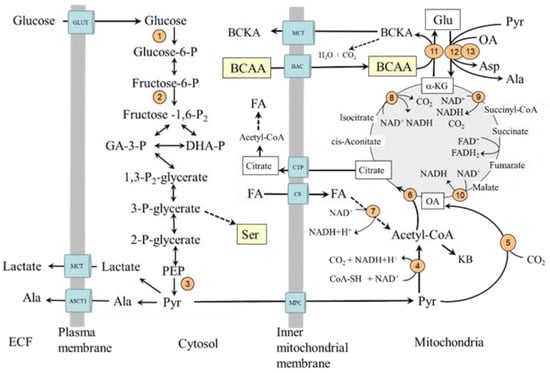 Figure 1. Glycolysis and its relationship to serine synthesis, beta-oxidation, citric acid cycle, and BCAA catabolism. 1, hexokinase; 2, phosphofructokinase; 3, pyruvate kinase; 4, pyruvate dehydrogenase; 5, pyruvate carboxylase; 6, citrate synthase; 7, beta-hydroxyacyl-CoA-dehydrogenase; 8, isocitrate dehydrogenase; 9, α-ketoglutarate dehydrogenase; 10, malate dehydrogenase; 11, BCAA aminotransferase; 12, AST; 13, ALT. BAC, branched-chain amino acid carrier (SLC25A44); BCAA, branched-chain amino acids; BCKA, branched-chain keto acids; CAC, citric acid cycle; CS, carnitine system; CTP citrate (tricarboxylate) transport protein; GLUT, glucose transporter; MCT, monocarboxylate transporter; MPC, mitochondrial pyruvate carrier; OA, oxaloacetate.