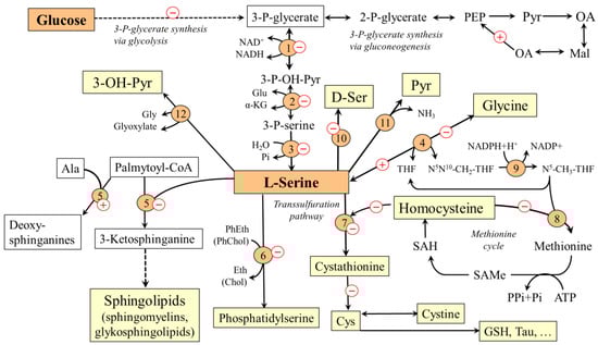 L-serine is a substrate for the synthesis of proteins, phospholipids, particularly phosphatidylserine, and sphingolipids, such as ceramides, phosphosphingolipids, and glycosphingolipids, which are in large amounts in the white matter of the brain and in the myelin sheaths of nerves. L-serine acts as an agonist of the glycine receptor and, therefore, is classified as an inhibitory neurotransmitter [28,29]. L-serine, in reaction with homocysteine catalyzed by cystathionine β-synthase, initiates the transsulfuration pathway. This makes L-serine important for homocysteine disposal and synthesis of several sulfur-containing substances, such as cysteine, cystine, taurine, and glutathione. The connection of L-serine with folate and methionine cycles enables its role in the synthesis of nucleotides and many methylation reactions. Neurological abnormalities observed in primary disorders of its synthesis indicate that the amounts of L-serine provided by food may not always be sufficient and that L-serine should be classified as a conditionally essential amino acid [30].