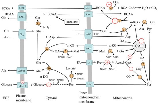 Figure 4. Muscle BCAA metabolism in diabetes. The pluses and minuses indicate the main changes associated with decreased glycolysis and preferential fatty acid oxidation resulting in impaired BCAA catabolism. 1, pyruvate dehydrogenase; 2, pyruvate carboxylase; 3, BCAA aminotransferase; 4, BCKA dehydrogenase; 5, AST mitochondrial; 6, AST cytosolic; 7, cytosolic malate dehydrogenase; 8, mitochondrial malate dehydrogenase 9, ALT mitochondrial; 10, ALT cytosolic; 11, lactate dehydrogenase; 12, glutamine synthetase. AGC, aspartate-glutamate carrier; ASCT1, alanine, serine, cysteine, and threonine carrier 1 (SLC1A4); BCAA, branched-chain amino acids; BAC, branched-chain amino acid carrier (SLC25A44); BCA-CoA, branched-chain acyl-CoA; BCKA, branched-chain keto acids; CAC, citric acid cycle; CS carnitine system; ECF, extracellular fluid; LAT1 (large neutral amino acid transporter 1); Mal, malate; MCT, monocarboxylate transporter; MKC, malate-ketoglutarate carrier; OA, oxaloacetate; MPC, mitochondrial pyruvate carrier; X-ag, a transporter for aspartate and glutamate (SLC1 family).
