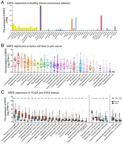Expression levels of the ERFE gene in human normal tissues and pan-cancer. (A) Consensus ERFE healthy tissue expression based on datasets of HPA, GTEx, and FANTOM5 (function annotation of the mammalian genome). (B) The expression distribution of the ERFE gene was visualized in 31 cancer types containing 1018 tumor cell lines from the CCLE dataset. (C) The expression distribution of the ERFE gene was visualized between the investigated 33 cancer types from the TCGA project and normal tissues from the GTEx database. The expression difference between the tumor and healthy groups was compared using the Wilcoxon rank sum test. Asterisks (*) stand for significance levels. ns, p ≥ 0.05; * p < 0.05; *** p < 0.001. Abbreviations: PCPG, pheochromocytoma and paraganglioma; T, tumor; N, normal tissues; CCLE, Cancer Cell Line Encyclopedia dataset; FANTOM5, Functional ANnoTation Of the Mammalian genome project 5.