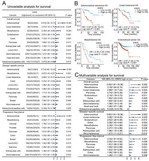 Prognostic significance of ERFE expression in pan-cancer. (A) Forest plot of survival (OS, DSS, and PFI) associations with ERFE expression levels in univariable analyses. Log-rank test was conducted in pan-cancer and results with p < 0.05 were summarized. (B) Examples of survival analysis are shown. Kaplan–Meier analysis was performed. (C) Forest plot of OS, DSS, and PFI associations with ERFE expression levels in multivariable analyses. Cox regression analysis was conducted using TNM and treatments as confounders. Results with p < 0.05 were summarized.