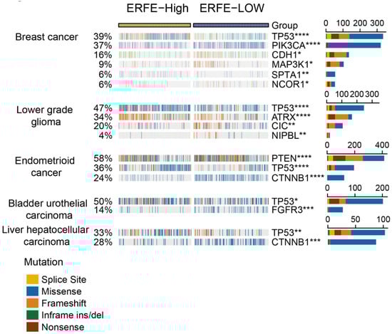 Due to the strong association of the ERFE expression with prognosis in multiple types of cancer, we next sought to provide explanations for this observation via analysis of available mutational data. Using the website tool of Comprehensive Analysis on Multi-Omics of Immunotherapy in pan-cancer (CAMOIP) [17], we found that the frequencies of mutations in several tumor suppressor genes (e.g., TP53 and PTEN) and oncogenes (e.g., CTNNB1) were unequally distributed in the ERFEhigh versus ERFElow groups. Of note, there was a strong association of ERFE overexpression with a higher frequency of TP53 mutations in breast, endometrioid, bladder, and liver cancers, and lower-grade glioma (Figure 3).