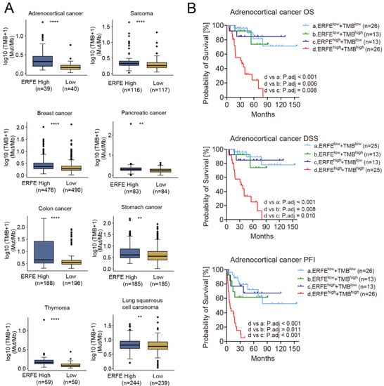 Due to the difference in the frequency of mutations in the ERFEhigh and ERFElow groups and the unequal distribution of TP53 mutations, an important driver of genomic instability, we compared the TMB between the two groups. Interestingly, the TMB was significantly higher in the ERFEhigh groups in n = 8 tumor types (Figure 4A). Among them, ERFE overexpression indicated poor prognosis in adrenocortical, pancreatic, and colon cancers (Figure 2C). Remarkably, in adrenocortical cancer, a shorter OS, DSS, and PFI due to the TMBhigh status was offset in the ERFElow patients, whereas the ERFEhighTMBhigh status was a very strong indicator of poor OS, DSS, and PFI in this tumor (Figure S1 and Figure 4B). Overall, our data shows an association between ERFE expression and TMB as well as a potential functional interplay between these two factors, which may be relevant for patient survival.