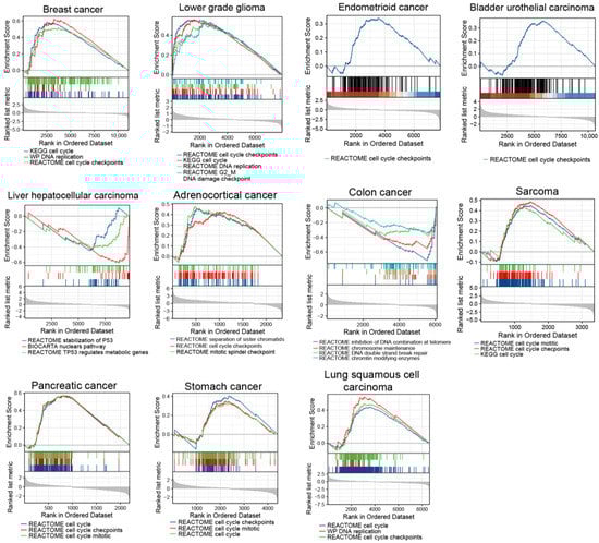 Since TP53 mutations and higher TMB are associated with genomic instability, which contribute to carcinogenesis and tumor cell proliferation [18,19], we assessed cell cycle states in ERFEhigh cancer samples. Therefore, we carried out a single-gene differential analysis (SGDA) followed by a gene set enrichment analysis (GSEA) based on the identified differentially expressed genes (DEGs) between the ERFEhigh and ERFElow groups in the tumors shown in Figure 3 and Figure 4A. Interestingly, the activated pathways involved in cell cycle and DNA replication as well as the processes involved in P53 stabilization and chromosomal maintenance were enriched in these tumors (Figure 5).
