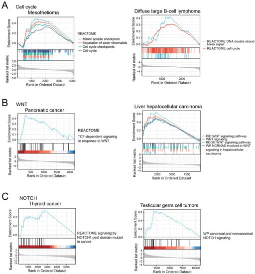 The activation of cell cycle (A), WNT (B), and NOTCH signaling pathways (C) in ERFEhigh tumor samples based on GSEA analysis.