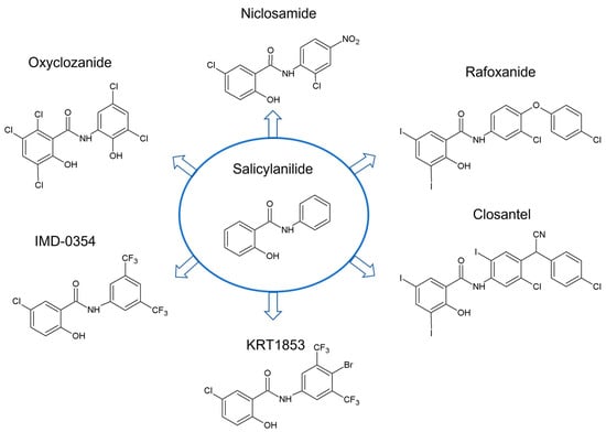 Salicylanilides found their use in medicine already in the 1940s [15,16]. Later, halogenated salicylanilides were used in both human and veterinary medicine as effective anthelmintic drugs such as niclosamide, rafoxanide or closantel [17]. Nevertheless, for many years, salicylanilides have been investigated for their diverse biological effects including antibacterial [18,19,20], antimycobacterial [21,22,23] and antifungal [24,25] activity. Gradually, further studies have significantly expanded the spectrum of salicylanilide effects including the primary evidence of potential anti-inflammatory action [26,27], but above all, the evidence of anticancer activity. Until now, a number of assumed mechanisms of salicylanilides’ anticancer effects have been described. For many years, salicylanilides have been known to be uncouplers of oxidative phosphorylation [28], but later studies suggested that mitochondrial uncoupling could be also responsible for their anticancer activity [4,6]. Compounds with salicylanilide scaffold were also shown to inhibit tyrosine kinase of epidermal growth factor receptor (TK EGFR), most likely by competition with ATP for binding at the catalytic domain of tyrosine kinase [29,30]. Finally, many salicylanilide anthelmintics were recently proven to inhibit diverse signaling pathways in cancer cells, thus inducing cell growth arrest, apoptosis, autophagy, etc. in diverse tumor cell types. Structures of salicylanilides that are currently being investigated for their potential anticancer activity are shown in Figure 1.