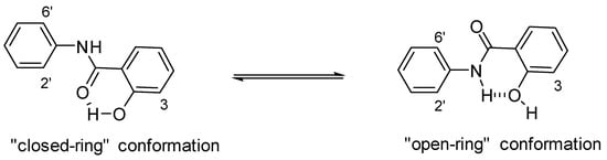Conformational equilibrium in salicylanilide molecules. Two possible intramolecular hydrogen bond formations resulting in closed-ring or open-ring conformation [52].