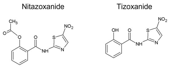 Structures of nitazoxanide and its metabolite tizoxanide.