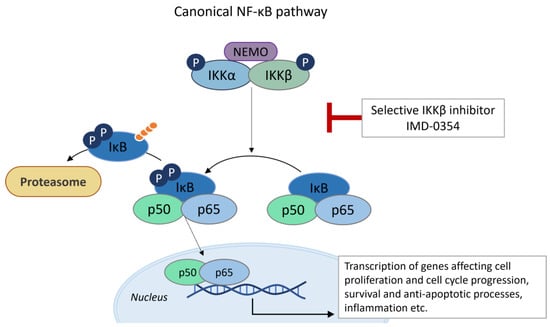 Nuclear factor kappa B (NF-κB) represents a protein transcription factor that is engaged in many biological processes. NF-κB plays a key role in the regulation of the immune system through inducing the expression of diverse mediators of immune processes. It is also associated with the regulation of inflammation, and affects cell proliferation and apoptosis. Additionally, its deregulation appears, e.g., in leukemia, Hodgkin lymphoma, as well as in diverse types of solid tumors. The inactive form of NF-κB is stabilized in association with IκB. As a response to stimuli of growth factors or inflammatory cytokines, a canonical signaling cascade is triggered, in which IKK, as catalytic subunit IκB kinase complex, phosphorylates IκBα, allowing its ubiquitination and proteasomal degradation. This process will trigger the translocation of NF-κB, as a transcriptional factor, into the cell nucleus, where it binds to specific DNA sequences, and thus regulates transcription target genes [132,133].