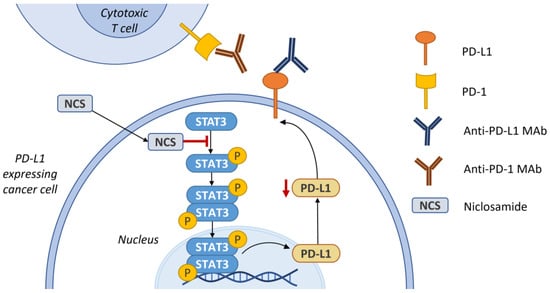 Synergistic activity of niclosamide with immune checkpoint inhibitors e.g., anti-PD-L1 or anti-PD-1 monoclonal antibodies. Niclosamide suppresses phosphorylation of STAT3 and thus downregulates the expression of PD-L1. Scheme was created according to [104,161].