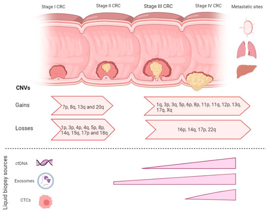 Over the years, increasing evidence has shown that copy number variations (CNVs) play an important role in the pathogenesis and prognosis of Colorectal Cancer (CRC). Colorectal adenomas are highly prevalent lesions, but only 5% of these adenomas ever progress to carcinoma. This review summarizes the different CNVs associated with adenoma-carcinoma CRC progression and with CRC staging. Characterization of CNVs in circulating free-RNA and in blood-derived exosomes augers well with the potential of using such assays for patient management and early detection of metastasis. To overcome the limitations related to tissue biopsies and tumor heterogeneity, using CNVs to characterize tumor-derived materials in biofluids provides less invasive sampling methods and a sample that collectively represents multiple tumor sites in heterogeneous samples. Liquid biopsies provide a source of circulating tumor DNA (ctDNA), circulating tumor cells (CTCs), tumor-derived exosomes (TDE), circulating free RNA, and non-coding RNA. This review provides an overview of the current diagnostic and predictive models from liquid biopsies.