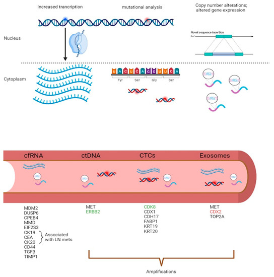 The most common sources of genetic material found in liquid biopsy sources. A list of genetic aberrations (gene amplifications and expression) is summarized in the figure below. Such data was collated from different literature sources. The green coded genes show CNVs associated with the carcinoma to metastatic progression, and the red coded gene shows CNVs associated with the adenoma to carcinoma progression.