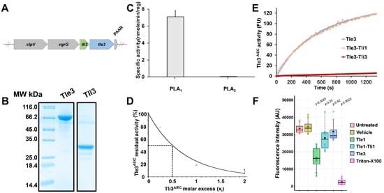) at molar ratio of 2, were used as controls. (F) Cytotoxic activities of Tle1EAEC and Tle3AIEC towards eukaryotic cells. Cytotoxicity experiments were carried with approximately 1 × 105 RAW264.7 cells/well pulsed with Tle1EAEC and Tle3AIEC recombinant proteins (30 µg) incubated for 16 h. Tle1EAEC phospholipase A2 and lysis buffer containing 1% Triton X-100 were used as positive controls. Alternatively, cells were incubated with medium containing the vehicle buffer or the Tle1EAEC-Tli1EAEC complex as additional negative controls. Viability was evaluated using resazurin assay. Results are displayed as box-plots with individuals’ raw data. Black dots were added to highlight the mean of each condition. Results are representative from n = 2 biologically independent experiments performed in technical quadruplicates. Statistical analysis was performed using Wilcoxon signed-rank test, where vehicle treatment was used as reference condition. Exact adjusted p-value are indicated on the graph and were considered significant when p ≤ 0.05.