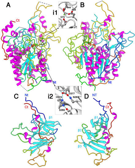 X-ray structure of Tle3AIEC and Tli3AIEC. (A) Structure of Tle3AIEC; the catalytic triad is colored red and the Ca2+ cation in green. (i1) The Ca2+ ligands. (i2) The catalytic triad. (B) Same view as (A) rotated 90° around a vertical axis. (C) Structure of Tli3. (D) Same view as (D) rotated 90° around a vertical axis. The three β-sheets are labeled β1–3. (A–D) The protein backbones are rainbow colored. The helices are colored magenta and the β-strands are colored blue. The inset atoms arec colored red (oxygen), blue (nitrogen), grey (carbon) and green (calcium).