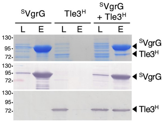 Tle3AIEC interacts with VgrGAIEC. Strep-tag II-tagged VgrG (SVgrG) and 6His-tagged Tle3 (Tle3H) were produced separately from E. coli BL21 (DE3) pETDuet-SVgrG and BL21 (DE3) pRSF-Tle3H cells, respectively. Lysates of cells (L) producing SVgrG, Tle3H or a 1:1 mix of SVgrG and Tle3H cell lysates (SVgrG + Tle3 H) were incubated with Strep-Tactin Sepharose resin. After five washing steps, the Strep-tagged and co-precipitated proteins were eluted with desthiobiotin (E) and analyzed by SDS–PAGE and Coomassie blue staining (upper panel) or immunoblotting using anti-StrepII (middle panel) and anti-His (lower panel) antibodies. The molecular weight markers (in kDa) are indicated on the left and the positions of SVgrG and Tle3H are indicated on the right.