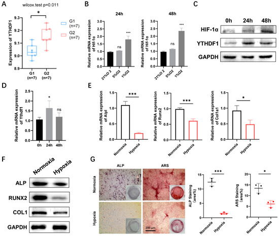Hypoxia-induced osteogenesis downregulation and YTHDF1 promotion in MC3T3-E1 cells. (A) The gene expression profile dataset GSE33774 in GEO was selected to evaluate the differential expression of YTHDF1 in normal groups (G1) and peri-implantitis groups (G2). (B) The expression of Hif-1a at different O2 concentrations (21%, 5%, 1%) for 24 h and 48 h were determined by qRT-PCR. (C) The protein expression of HIF-1α and YTHDF1 at 1% O2 concentrations at different time points by Western blot. GAPDH was used as the internal control. (D) The mRNA expression of YTHDF1 under 1% O2 concentration conditions at different time points. (E) mRNA expression of osteogenic differentiation-related marker genes including Alpl, Runx2, and Col1a1 under hypoxic treatment. (F) Protein level of ALP, RUNX2, and COL1 under hypoxia was verified by Western blot. (G) ALP staining and ARS staining showed reduced osteogenic ability in MC3T3-E1 cells under hypoxic conditions. Scale bar, 200 μm, n = 3. Results are presented as mean ± SD, Student’s t-tests, and one-way ANOVA followed by Tukey’s test (ns: not significant, * p < 0.05, *** p < 0.001, compared with the control group). YTHDF1, Yth m6A RNA-binding protein 1; HIF-1α, hypoxia-inducible factor-1α; ALP, alkaline phosphatase; RUNX2, runt-related transcription factor 2; COL1, type 1 collagen; ARS, alizarin red staining.