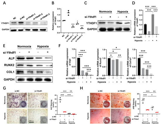 To determine the role of the m6A methylation reader YTHDF1 as a regulator of bone formation under hypoxic conditions, we performed loss-of-function experiments in MC3T3-E1 cells. YTHDF1 expression was suppressed with short interfering RNA (siRNA). When YTHDF1 was silenced, YTHDF1 protein and mRNA levels were remarkably knocked down compared to the si-NC (Figure 2A,B). We evaluated the knockdown efficiency of the three siRNAs, and the si-Ythdf1-3 with the best efficiency was utilized in the following experiments. Both in normoxic and hypoxic conditions, YTHDF1 knockdown resulted in the downregulation of mRNA and protein expression of YTHDF1 in MC3T3-E1 cells, whereas under hypoxic conditions, YTHDF1 expression appeared to increase compared to normoxia (Figure 2C,D). Under normoxic conditions, lessened protein expression levels of osteogenic differentiation-related markers ALP, RUNX2, and COL1 in YTHDF1 knockdown MC3T3-E1 cells were also verified by Western blot (Figure 2E), and silenced YTHDF1 led to a significant decrease in mRNA expression of Alpl, Runx2, and Col1a1 in MC3T3-E1 cells after 24 h culture (Figure 2F). The mRNA expression of osteoblast-specific genes declined significantly compared to the normoxia groups, with the most evident decrease in the YTHDF1 knockdown group under hypoxia. The staining intensities of ALP and ARS were also weakened in the MC3T3-E1 cells of the YTHDF1 knockdown groups compared to the control groups, with YTHDF1 silencing under hypoxia showing the lowest staining intensity (Figure 2G,H). The data from the loss-of-function experiments indicated that YTHDF1 facilitated the osteogenic differentiation of MC3T3-E1 cells under both normoxia and hypoxia.