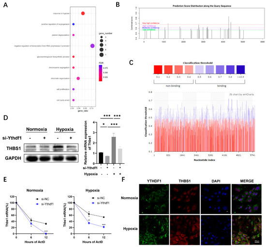 Furthermore, we assumed that YTHDF1 could co-localize with THBS1 in MC3T3-E1 cells under hypoxia. To obtain the precise localization of YTHDF1 and THBS1, we also conducted immunofluorescence (IF) assays and found that under normoxia conditions, the THBS1 protein was located in the nucleus while YTHDF1 protein was located in the cytoplasm. After 24 h of being cultured under hypoxia conditions, the YTHDF1 expression increased compared to the control cells and was found co-localized with THBS1 in the cytoplasm (Figure 3F). These results suggest that YTHDF1 may be related to the osteogenesis of MC3T3-E1 cells under hypoxia through post-transcriptional regulation of the mRNA of THBS1.