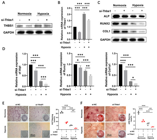 We have demonstrated the promotional effect of YTHDF1 on the osteogenic differentiation of MC3T3-E1 cells under hypoxia, and the above experiments predicted THBS1 as a downstream target of YTHDF1. Subsequently, we applied a loss-of-function approach to determine the effect of THBS1 on osteogenesis under normoxic and hypoxic conditions. After transfection of si-Thbs1 for 48 h, the knockdown efficiency was verified by qRT-PCR and Western blot analysis under both normoxia and hypoxia (Figure 4A). Hypoxia boosted THBS1 expression, and silencing of THBS1 knocked down the expression level of THBS1 under both normoxia and hypoxia. During osteogenic differentiation of MC3T3-E1 cells, silencing of THBS1 significantly suppressed the mRNA expression and protein levels of osteogenic-related ALP, RUNX2, and COL1 under hypoxia, and the knockdown of THBS1 under hypoxia showed the most significant inhibition of osteogenesis (Figure 4C,D). Results of ALP and ARS staining experiments also indicated that knocking down of THBS1 declined the mineralization of MC3T3-E1 cells under normoxia and hypoxia, with the lowest staining intensity shown in cells transfected with si-Thbs1 under hypoxia (Figure 4E,F).