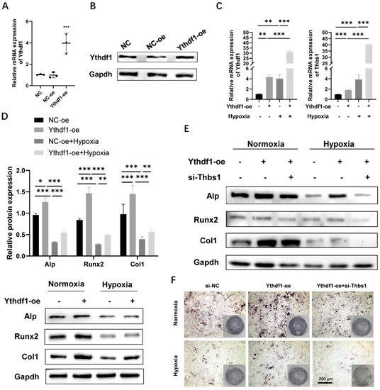 Overexpression of YTHDF1 was achieved by transfection of Ythdf1-oe plasmid into MC3T3-E1 cells. The transfection efficiency was validated by qRT-PCR and Western blot analysis 48 h after Thbs1-oe transfection (Figure 5A,B). Our previous analysis predicted that YTHDF1-dependent m6A methylation of THBS1 mRNAs correlates with osteogenic differentiation of MC3T3-E1 cells. The results verified that overexpressed YTHDF1 promoted YTHDF1 and THBS1 mRNA expression under both normoxia and hypoxia, and the extent of enhancement was significantly higher under hypoxia (Figure 5C). The co-localization of YTHDF1 and THBS1 after overexpression of YTHDF1 also corroborated the results of qRT-PCR (Figure S1). In contrast to knockdown experiments, overexpression of YTHDF1 optimized the expression of protein related to osteogenic differentiation (Figure 5D). Next, we went on to provide further insight into the molecular mechanisms underlying our findings. After performing co-transfection of si-Thbs1 with Ythdf1-oe on MC3T3-E1 cells, we examined the protein expression level of osteogenesis-related genes under normoxia and hypoxia. Consistent with our hypothesis, the Western blot revealed that under both normoxic and hypoxic conditions, silencing THBS1 reverted the upregulation of osteogenesis-related protein expression of ALP, RUNX2, and COL1 caused by YTHDF1 overexpression (Figure 5E). ALP staining results also indicated that after co-transfection of si-Thbs1 with overexpressed YTHDF1, the osteogenesis-enabling effect of YTHDF1 overexpression was attenuated (Figure 5F). These results suggest that MC3T3-E1 cells may promote osteogenesis through the YTHDF1/THBS1 pathway, either by upregulating the expression of YTHDF1 or THBS1, respectively, to resist hypoxia-induced osteogenic inhibition.
