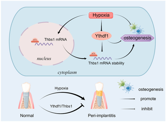 The limitation of our study is that the downstream targets of YTHDF1 may not be limited to THBS1, and further studies that explore other downstream targets of YTHDF1 are required for a better understanding of the role of YTHDF1 in the pathogenesis of peri-implantitis. Moreover, the mechanism of THBS1 in promoting osteogenesis under hypoxia requires further exploration. In addition, in vivo studies to validate our findings should be performed in further experiments.