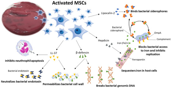 - Krasnodembskaya, A.; Song, Y.; Fang, X.; Gupta, N.; Serikov, V.; Lee, J.W.; Matthay, M.A. Antibacterial effect of human mesenchymal stem cells is mediated in part from secretion of the antimicrobial peptide LL-37. Stem Cells 2010, 28, 2229–2238. [Google Scholar] [CrossRef]