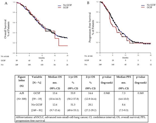 Clinical data were analysed by descriptive statistics, using percentages for the binary variables and medians for the continuous variables, reporting their respective dispersion values. For the comparison of binary variables, the chi-square test with an acceptable significance value of p < 0.05 was performed. The OS was calculated from the treatment start date until death or the date of the last follow-up; the PFS was taken from the treatment start date to disease progression or death from any cause. Patients who had not had any events at the time of the analysis were censored. OS and PFS were estimated using the Kaplan–Meier method and reported as medians with confidence limits (95% CIs), and compared using a two-sided log-rank test with an acceptable significance value of p < 0.05 [23]. An interaction test between the GCSF primary prophylaxis and the above factors was performed. The statistical analysis was carried out using the SigmaPlot software version 12.5 (Systat Software, San Jose, CA, USA).