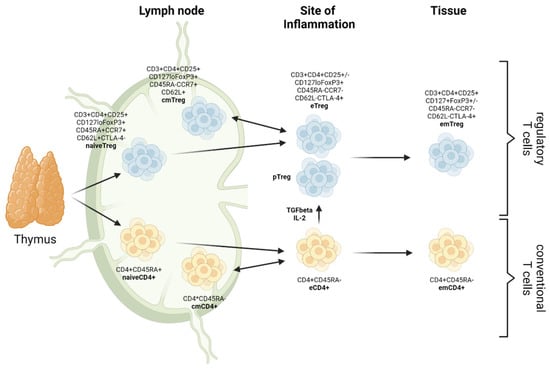 Differentiation dynamics and plasticity of (regulatory) T cells. cm: central memory; em: effector memory; e: effector; p: peripheral (created with biorender.com).
