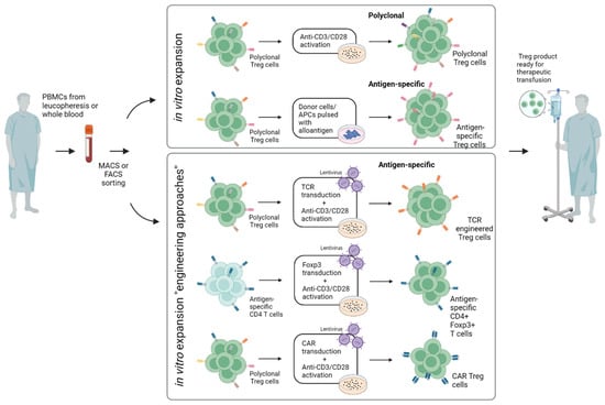 Different approaches for in vitro expansion of Tregs. Engineering approaches are supposed to increase specificity and feasibility. PBMCs: peripheral blood mononuclear cells; FACS: fluorescence-activated cell sorting; MACS: magnetic-activated cell sorting; APC: antigen-presenting cell; TCR: T cell receptor; CAR: chimeric antigen receptor (created with biorender.com).