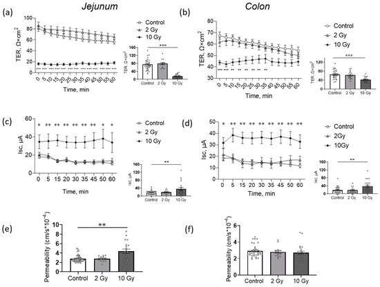Transepithelial resistance (TER) and short-circuit current (Isc) were evaluated in an Ussing chamber as a physiological indicator of the barrier and transport functions of jejunum and colon tissues. The 2-Gy IR did not affect the electrophysiological parameters of the jejunum or colon (Figure 2a–d). Previously, while studying dose- and time-dependence of IR effects on rat intestines, 72 h after 10-Gy IR was shown to be the experimental point at which the disturbance of the barrier and transport functions of the jejunum were obtained [27]. Here, as expected, exposure to 10-Gy IR significantly and dramatically decreased TER (p < 0.001) and increased Isc (p < 0.01) in the jejunum and colon (Figure 2a,c). Paracellular flux of sodium fluorescein, often used as biomarker of epithelium permeability [28,29], was also increased in the jejunum (p < 0.01) in the 10-Gy-irradiated group (Figure 2e).