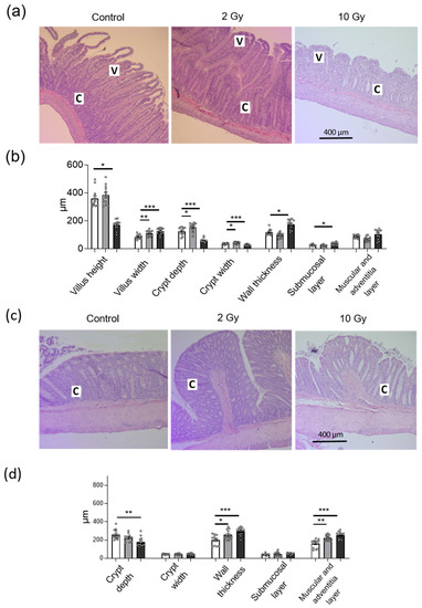 Histopathology of the jejunum (a,b) and colon (c,d) rat tissues after IR exposure. (a,c) H&E-stained sections of jejunum and colon after IR exposure; C—crypt, V—villus. (b,d) Histopathological parameters of rat jejunum and colon after IR exposure. The number of symbols corresponds to the number of H&E sections analyzed (see Section 4). One-way ANOVA followed by Bonferroni multiple comparisons test. * p < 0.05, ** p < 0.01, *** p < 0.001—2-Gy- or 10-Gy-irradiated group vs. control.
