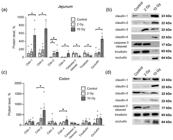 TJ protein content was measured in homogenates of the jejunum and colon sections after rat exposure to IR. Exposure to 10-Gy IR significantly increased the protein content of claudin-1, -2, -3, -4 and occludin in the jejunum, and decreased the level of tricellulin (p < 0.05 each) (Figure 4a,b). The 2-Gy IR significantly increased the level of claudin-3 in the jejunum only (p < 0.05). The level of 17 kDa cleaved caspase-3, used as an indicator of apoptosis [9,10,32], did not change after 2-Gy exposure, although it was significantly decreased in the jejunum after 10-Gy irradiation (p < 0.05) (Figure 4a,b).