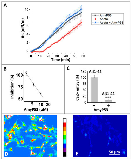 AmyP53 is a competitive inhibitor of Aβ1–42 binding to gangliosides and subsequent neurotoxicity events. (A) Effect of AmyP53 (10 µM), or Aβ1–42 (10 µM), or a mixture of both (each at 10 µM) added underneath a ternary monolayer (POPC: GM1: cholesterol, 10: 5: 5 mol: mol: mol). The data were expressed as the surface pressure increase (Δπ) ± SD (n = 3) over the time (left panel, 60 min; right panel, 20 min). (B) Inhibitory effect of AmyP53 for Aβ1–42 binding to aged SHSY-5Y cells. (C) Ca2+ fluxes induced by Aβ1–42 (220 nM) added for 1 h to aged SHSY-5Y cells preloaded with Fluo-4AM, in absence (−) or presence (+) of AmyP53 (220 nM). Data are expressed mean ± SD of 3 distinct experiments (Student’s test ***; p < 0.05). Corresponding micrographs taken at 60 min show the effect of Aβ1–42 alone (D) or Aβ1–42 incubated in presence of AmyP53 (E). The images in panels (D,E) show pseudocolor representations of cells at the end of the incubation (warmer colors corresponding to higher fluorescence, according to the scale between the micrographs).
