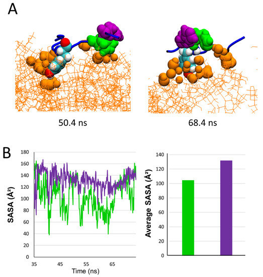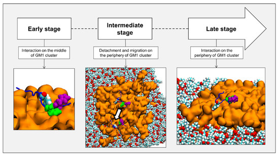 Molecular dynamics simulations (MDS) allowed us to analyze, at the atomic level, the mechanisms controlling the interaction of the AmyP53 peptide with a GM1 ganglioside raft. These studies revealed previously undescribed mechanisms for a peptide–ganglioside interaction. The first surprise was to observe that the AmyP53 peptide is initially attracted to the central zone of the raft to which it binds almost instantaneously. This is probably due to the higher density of negative electric charges in the center of the raft, where the gangliosides are the most condensed. However, this initial interaction is not stable, and the peptide quickly detaches from this zone. This is the other side of the coin: the more the gangliosides are condensed, the less they are free to adjust their shape to stabilize the attachment of the AmyP53 peptide, despite a strong electrical field. Indeed, our study revealed that central gangliosides are less hydrated and less exposed to the solvent than peripheral ones (Figure 8) and are thus more packed. One should also note that the repulsive forces, due to the negative charge of GM1, are counterbalanced by the N-acetyl group of GalNAc which neutralizes the negative charge of the sialic acid. This effect, that we coined “NH trick”, is key to understanding the different topologies adopted by gangliosides (chalice-like at the edge of lipid rafts, condensed clusters in central areas) and their impact on protein binding [54]. Overall, this explains why the peptide detaches from the central zone of the raft, to reach the more mobile gangliosides of the periphery of the raft. This second attachment is much stronger than the first, the peptide gradually strengthening its anchoring to the surface of the raft. We have therefore analyzed three successive stages (early, intermediate, and late) describing the entire process.