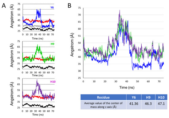 (A) Set of plots showing the center of mass over the time along the z-axis for Y6 (blue line, top plot), H9 (green line, mid plot), and H10 (purple line, bottom plot) compared to the average of maximum value over time along the z-axis for sialic acid (red line, all plots), glucose (gray line, top plot), and the ceramide part of GM1 molecules (black line, all plots). (B) Plot showing the center of mass along the z-axis over time for Y6 (blue line), H9 (green line), and H10 (purple line) and table below the plot showing the average value of the center of mass along the z-axis for each aromatic residue.