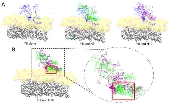 To compare more accurately the interaction of H9 and H10 with the lipid raft, we illustrated the travel trail throughout the trajectory of each aromatic residue, taking as reference their center of mass. The travel trail of Y6 is the one which penetrates the most deeply in the lipid raft (Figure 5A), consistent with the plots presented in Figure 4. The travel trails of H9 and H10 revealed that H9 is the one that establishes more interactions with the polar part of the lipid raft (Figure 5B). Overall, our computational data suggest that Y6 and H9 are the most critical amino acids that control the association of AmyP53 with the GM1 cluster.