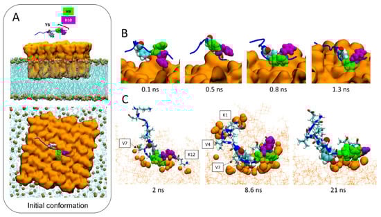 In the initial conditions, AmyP53 is placed above the central zone of the lipid raft, with the side chain of its aromatic residues Y6 and H10 pointing towards the sugar moiety of GM1 molecules (Figure 6A). The dynamic of the peptide begins with a reversal effect which brings the side chain of H9 in contact with the lipid raft while the side chain of H10 points towards the opposite direction of the membrane (Figure 6B). However, H10 does not remain inactive. As shown by three different snapshots taken at 2, 8.6, and 21 ns (Figure 6C), we can see that H10 also participates in the interaction of AmyP53 with the raft through direct contacts with the sugar residues of GM1 molecules. At this stage, H9 and H10 resemble the open wings of a butterfly foraging on the lipid raft surface. In addition to these three residues (Y6, H9, and H10), we can also observe that lysine-1 (K1) and lysine-12 (K12) also interact with the lipid raft via hydrogen bonds and electrostatic interactions, whereas valine residues V4 and V7 interact with GM1 molecules via Van der Waals interactions.
