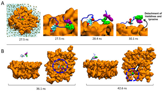 The simulations also made it possible to better understand the respective roles of the two histidine residues incorporated into the AmyP53 peptide sequence during its design. These two histidines are derived from the ganglioside-binding domain of Aβ1–42 [30]. It is a significant improvement that gives the peptide the ability to bind to a broader repertoire of gangliosides in the brain, and in particular GM1. However, our alanine scanning studies had curiously revealed that the ganglioside-binding motif of Aβ1–42 lost all GM1 recognition function if these two histidines were substituted, but unexpectedly also when each histidine was independently replaced by alanine [29,55]. Thanks to our new simulations, we were able to solve this enigma. In fact, it is the H9 residue that is most critical for GM1 binding. However, the H10 residue reinforces this interaction by coming into contact with H9, which drives out water molecules and gives an entropic contribution to the binding of H9. Moreover, as remarkably anticipated in a previous molecular modeling study performed with a simpler system [30], these two histidines adopt an open butterfly wing structure, which balances the peptide when it lands on the surface of the GM1 gangliosides (Figure 10). In this conformation, the positive electrostatic potential is harmoniously distributed over the surface of AmyP53, which is then strongly attracted by the negative electric field of the gangliosides of the raft. Finally, our data show that the central tyrosine residue of AmyP53 plays a key role in the insertion of the peptide between the polar head groups of gangliosides, confirming previous data obtained with the parental ganglioside-binding domains of Aβ1–42 and α-synuclein [29,30,55].