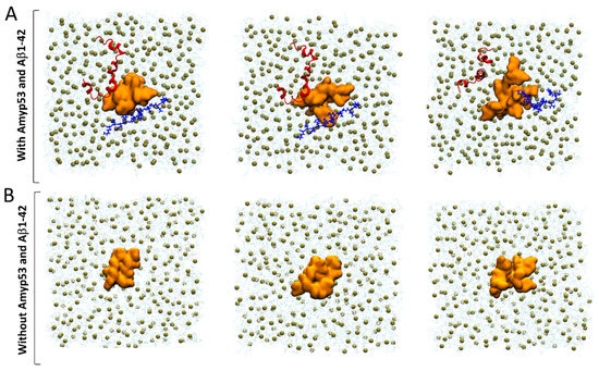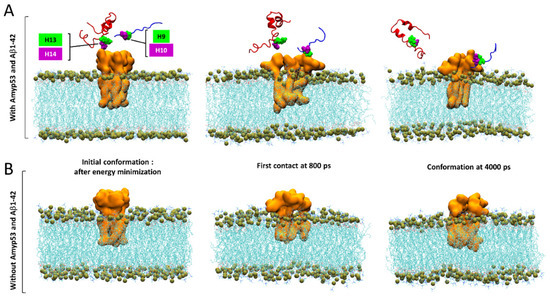 The second surprise of this study was to reveal the active role of raft gangliosides, whose conformational reorganizations (formation of crevices) seem to precede the binding of the AmyP53 peptide. We thus discovered that the attachment of AmyP53 to rafts is a dynamic process involving simultaneously several gangliosides and the peptide itself. Subjected to the concomitant influences of water molecules and gangliosides, AmyP53 is taken up by the raft extremely quickly and efficiently. Even in the presence of the amyloid protein Aβ1–42, initially positioned advantageously on the surface of the raft, AmyP53 wins the competition (Figure 10 and Figure 11). The kinetic advantage of AmyP53 is therefore well demonstrated at the different scales tested: atomic, molecular, physicochemical, and cellular. This advantage is also preserved on hippocampal slices incubated in the presence of Aβ1–42. In this case, AmyP53 prevents the shut-down of the electrophysiological activity of the neural network caused by Aβ1–42 [27].