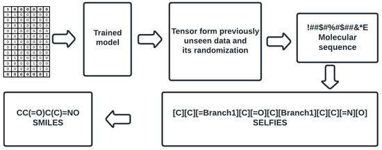The given model shows the possibility of learning chemistry via neural networks. Application of SELFIES codes leads to no errors during the prediction step. In the case of the application of SMILES chemical information, there is a possibility of the formation of incorrect structures [2,30]. This fact is due to the lower robustness of the SMILES notation in comparison to SELFIES [2,30]. This model can handle molecules whose representation in the SELFIES form is shorter than 65 characters.