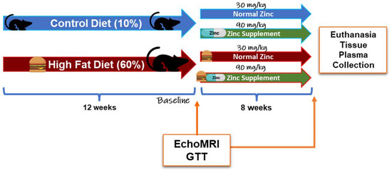 Animal use, protocols, and procedures were approved by the University of Louisville Institutional Animal Care and Use Committee (OLAW/PHS Assurance No. A3586-01; USDA Registration No. 61-R-001-01). The University of Louisville is an Association for the Assessment and Accreditation of Laboratory Animal Care, International (AAALAC) accredited institution. Male C57BL/6J mice (8-weeks-old; n = 60) were purchased from Jackson Laboratory (Bar Harbor, ME, USA). Mice were housed in a temperature- and light-controlled room with a 12 h light/dark cycle. Mice were allowed to acclimate after the facility transfer for one week and were fed autoclaved standard laboratory rodent chow. After acclimation, mice were switched to purified diets to minimize the influence of metal contamination found in standard chow on experimental outcomes [23,24]. Specifically, mice were either fed a control diet (CD, 10% kcal fat; Research Diets D14020202, New Brunswick, NJ, USA) or a HFD (60% kcal fat; Research Diets D14020205, New Brunswick, NJ, USA) for 12 weeks. After 12 weeks, mice were further grouped into diets containing either 30 mg or 90 mg zinc/4057 kcal, representing the normal zinc (NZ) and added zinc (ZS) diets, respectively. (CD + Zn—Research Diets D14020203; HFD + Zn—Research Diets D14020206, New Brunswick, NJ, USA) for an additional 8 weeks [Figure 1]. Food and water were provided ad libitum. Body weights and food consumption were recorded weekly. Intraperitoneal glucose tolerance tests (IPGTT) were performed at weeks 12 and 19. Prior to euthanasia, the body composition of the animals was determined by quantitative magnetic resonance imaging using an EchoMRI-500 Body Composition Analyzer (Echo Medical Systems, Houston, TX, USA). At the end of 20 weeks, mice were anesthetized (ketamine/xylazine, 120/16 mg/kg body weight) via i.p. injection, followed by blood collection from the inferior vena cava and subsequent euthanasia via exsanguination. Blood samples were centrifuged, and plasma was stored at −80 °C for further biochemical analysis. Liver weight was recorded for each mouse, and portions of liver tissue were snap-frozen in liquid nitrogen, processed for RNA isolation, fixed in 10% neutral buffered formalin for histology, and used for metal analysis. The liver weight to tibia length ratio (liver weight in grams divided by tibia length in millimeters) was used as an index of liver size changes. Mice were fasted overnight prior to sacrifice.