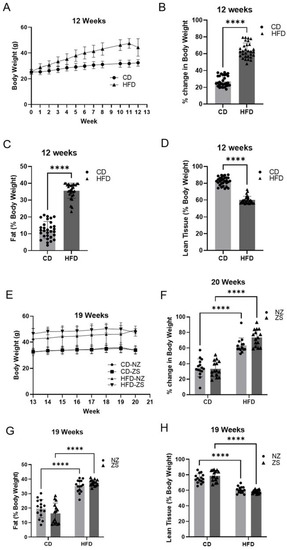 Body weights were recorded weekly during the 20-week study period. All groups experienced weight gain, with HFD-fed mice gaining significantly more weight compared with CD-fed mice (p < 0.0001) (Figure 2A,B,E,F). Zinc supplementation had no significant effect on the mean percent body weight gain in both the HFD and CD zinc-supplemented mice (Figure 2E). As expected, HFD-fed mice experienced a significant increase in percent body fat (p < 0.0001) and a contrasting decrease in percent lean tissue (p < 0.0001) compared with CD-fed mice (Figure 2B,C,G,H). Similar to the effects on body weight, zinc-supplemented mice did not show significant differences in percent body fat or percent lean tissue compared with normal zinc-fed mice. The observed data suggest the HFD was successful in inducing obesity in HFD-fed mice.