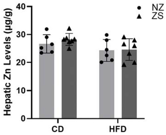 Mice were administered zinc in their food; therefore, we measured zinc levels in the diet and liver tissues. As expected, diets supplemented with zinc had three times the amount of zinc compared with levels in the normal zinc diets. CD with and without zinc supplement had 90.3 µg zinc/g of diet and 30.3 µg zinc/g of diet, respectively, while the HFD with and without zinc supplement had 124.0 µg zinc/g of diet and 40.0 µg zinc/g of diet, respectively. No significant differences were observed in hepatic zinc levels across groups (Figure 3). Zinc supplementation did not alter zinc accumulation in HFD, nor CD zinc supplemented mice compared with normal diet fed mice.