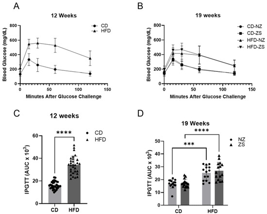 To assess glucose intolerance, often associated with NAFLD, glucose tolerance tests were performed at weeks 12 and 19. At week 12, HFD-fed mice had significantly increased blood glucose and AUC compared with CD-fed mice (Figure 4A,C) (p < 0.0001). After 7 weeks of subsequent zinc supplementation, HFD-fed mice still showed reduced glucose clearance and increased glucose AUC. However, zinc supplementation did not result in a significant difference in blood glucose and AUC between the supplemented and normal zinc groups. Similar observations were made in CD-fed mice. In summary, HFD was associated with reduced glucose clearance, of which zinc supplementation had no impact.