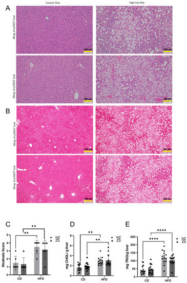 Histological analysis showed significant increases in steatosis in the HFD-fed mice compared with the CD-fed mice, as seen in representative photomicrographs of H&E (Figure 6A) as well as in the quantification of the histology (Figure 6C). Furthermore, the biochemical analysis of liver tissue revealed mice fed the HFD had greater total cholesterol and hepatic triglyceride levels compared with mice fed the CD (Figure 6D,E). Dietary zinc supplementation did not significantly alter the histological or biochemical parameters of NAFLD in either diet group. No qualitative differences in collagen deposition, as seen in representative photomicrographs of Masson Trichrome, were observed between any of the groups (Figure 6B), and this was confirmed quantitatively (data not shown). Taken together, the data showed HFD was able to induce liver injury, of which zinc supplementation was unable to attenuate.