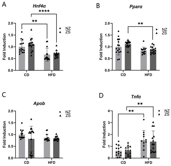 Liver tissues were homogenized using 1 mL of chilled RNA-STAT 60TM (catalog: CS502; Tel-test Inc.; Friendswood, TX) per 50–100 mg of tissue in a 2 mL screwcap tube containing 0.5 mm glass silica beads, followed by homogenization for 30 s using a mini-beadbeater (Sigma Aldrich, St. Louis, MO, USA). Total RNA was then extracted, precipitated, and washed following the RNA-STAT 60 reagent protocol for the isolation of total RNA, DNA, and protein by AMSBIO. RNA quantity and purity were assessed with Nanodrop OneC (Thermo Scientific, catalog: 701-058112; Madison, MI, USA). cDNA was reverse transcribed from 3 µg total RNA to yield 60 µL using the single step cDNA synthesis reagent QScript (Quantabio; Catalog: 95048-500), following the manufacturer’s protocol. qRT-PCR was performed on a CFX384 Touch Real-Time PCR Thermal Cycler (Bio-Rad, Hercules, CA) using iTaq Universal Probe Supermix (catalog:1725134; Biorad, Hercules, CA, USA) according to the manufacturer’s protocol. Primer sequences from TaqMan Gene Expression Assays (ThermoFisher Scientific) were as follows: hepatocyte nuclear factor 4 alpha (Hnf4α); (Mm01247712_m1), tumor necrosis factor alpha (TNFα); (Mm00443258_m1), peroxisome proliferator-activated receptor alpha (Pparα); (Mm00440939_m1), adiponectin (Adipoq); (Mm04933656_m1) and apolipoprotein B (Apob); (Mm01545150_m1). Levels of mRNA expression were calculated using the 2-ΔΔCt method. Fold induction was calculated and normalized relative to the amount of Glyceraldehyde-3-Phosphate Dehydrogenase (GAPDH) mRNA (catalog:4352339E, ThermoFisher Scientific; Madison, MI, USA), and expression levels of mice fed the control diet with no zinc supplementation, which were set to 1.