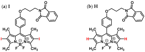 Two BODIPY chromophores (I and H), synthesized in a two-step process, described previously in detail [26], were supplied by J. Piskorz from Poznan University of Medical Sciences in Poland. The chemical structures of these dyes have been confirmed by mass spectrometry (HRMS) and 1H and 13C NMR spectroscopy. The chemical formulae, systematic names, and abbreviations are shown in Figure 1.