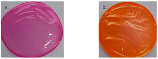 Photo of chitosan film (a) with 5% addition of I and (b) with 5% addition of H dyes.