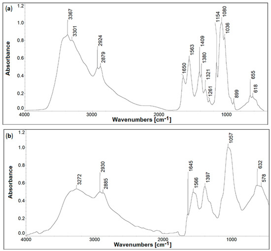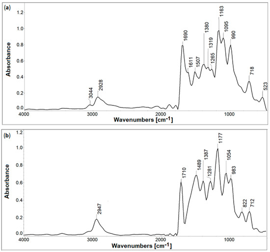 Infrared spectra were obtained using Spectrum Two (Perkin Elmer, Waltham, MA, USA) with an ATR attachment containing a diamond crystal (angle of incidence 45°, one reflection). The range was 4000–400 cm−1, the scanning speed was 0.2 cm/s, and the number of scans was 32.